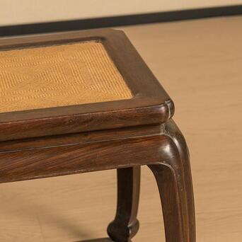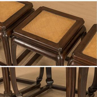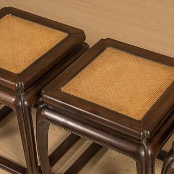 本组四只方凳结构统一,均简洁素雅,座面以攒框制成,镶以藤编软屉,四角倒出委角,增添变化,束腰内收,牙板窄而平,无雕无琢,保留最本真的古朴风格,腿足外鼓,中间延续座面的委角锼挖,简素中有匠心独运。底足内翻,接以托泥,加重底部的视觉效果,更显敦厚稳健,且持久耐用。