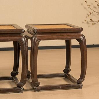 整组方凳以上等红木制成,色泽深沉浓郁,包浆细腻古雅,二者相辅相成,共同构成其低调内秀的风格特点,其整体结构为明式家具的经典,可谓收藏的不二良器。